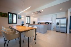 The villa is equipped with a Loxone smart home system, enabling remote control of temperature, humidity, heating, hot water, and the pool. It is pre-wired for the installation of security cameras and an alarm system. The RainBird automatic irrigation system, responsive to real-time weather conditions, ensures effortless maintenance of the outdoor areas.