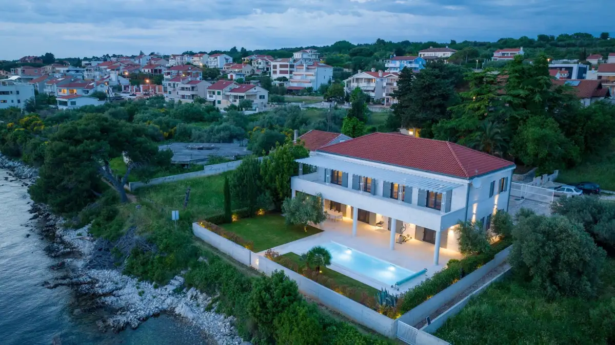 We offer for sale an attractive stone villa of 419 sqm, spread over two levels, located in a prestigious seafront position in one of the most desirable areas of the central Adriatic, near Zadar. Built on an 814 sqm plot, the villa offers a refined blend of understated luxury, complete privacy, and modern technology—seamlessly integrated into the authentic Mediterranean surroundings.