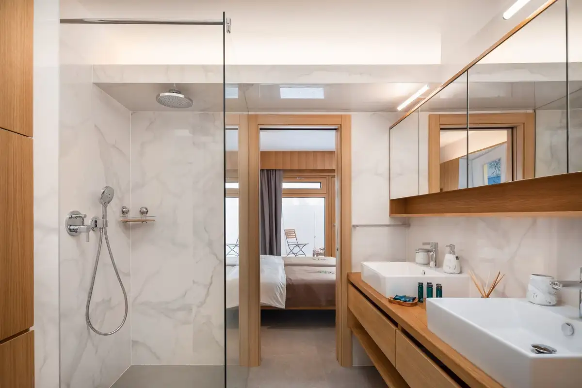 The first floor is dedicated to the wellness area, which offers everything for relaxation and regeneration: an entrance area with a gym, a hydromassage whirlpool, a tropical shower, a sauna, a relaxation room and a spacious terrace with sea views - ideal for private relaxation or wellness weekends with friends.