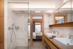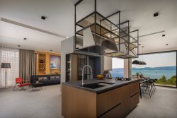 The second floor is the heart of the entire villa - it houses the exclusive kitchen and dining room with a south facing glass wall that provides plenty of natural light and beautiful sea views. On the north side is the living room with direct access to the terrace with heated pool and sunbathing area. On this floor there are also three luxurious bedrooms, each with its own bathroom and private courtyard.