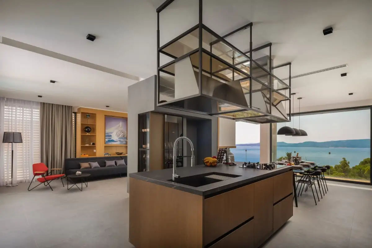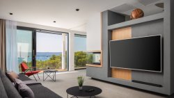 We offer for sale an attractive luxury villa with breathtaking sea views, located in a quiet area near the popular resort of Omis. This exceptionally designed villa with a total living area of 289 sqm is spread over four levels - ground floor, two floors above ground and a roof terrace - and is equipped with a range of premium features for maximum comfort and modern lifestyle.