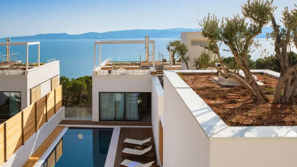All floors are connected by a lift and a comfortable staircase. In the whole villa is installed underfloor heating and air conditioning. Another unique architectural element is the green roofs of the bedrooms and living room - each of them bears an olive tree surrounded by Mediterranean vegetation, which not only aesthetically completes the space, but also provides natural thermal insulation.
