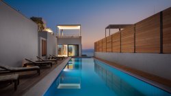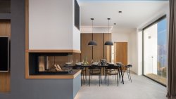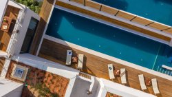 Upstairs, a spacious kitchen and dining room, designed with the finest materials with an emphasis on functionality and design. The south wall is all-glass and opens up to an impressive sea view, while the northern part of the living room flows seamlessly into the outdoor space with a terrace, swimming pool, outdoor shower and sun loungers. This level also includes three bedrooms, each with its own bathroom and private terrace.