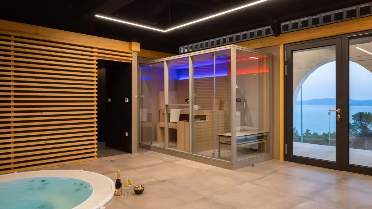 On the first floor there is a sophisticated wellness area, which includes a lobby, gym, sauna, tropical shower, hydro-massage whirlpool and relaxation room. A large terrace overlooking the sea gives the whole area an exceptional atmosphere.