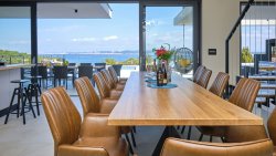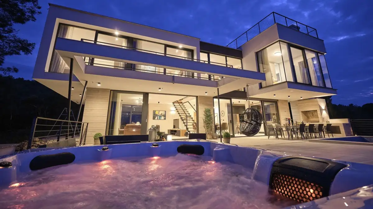 On the ground floor there is a comfortable bedroom with en-suite bathroom, sauna with additional bathroom, fitness room, tavern with indoor barbecue and billiards, laundry room and garage. The first floor consists of a bedroom with bathroom, separate toilet, designer kitchen with dining area and spacious living room, which flows seamlessly onto the terrace with hot tub, heated pool and relaxation area.