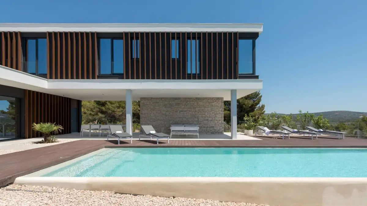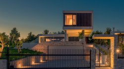 We offer for sale a unique modern villa with an impressive view of the sea and the surrounding islands, situated in a prestigious location near the town of Primosten. This architecturally distinctive property is situated on a plot of 850 m² and offers a living area of 300 m², divided into three floors - basement, ground floor and first floor.