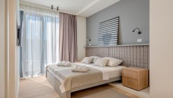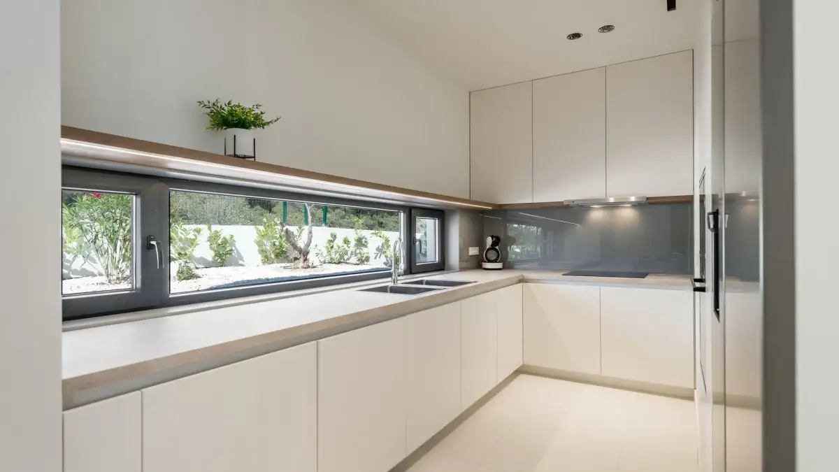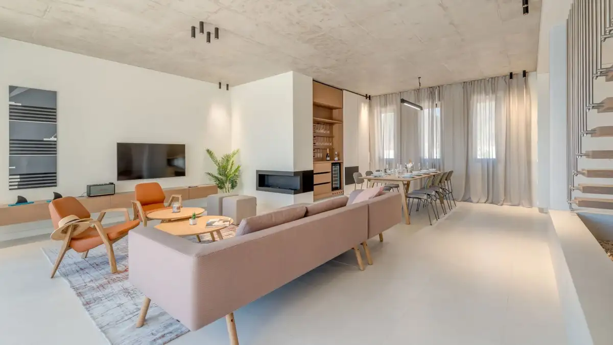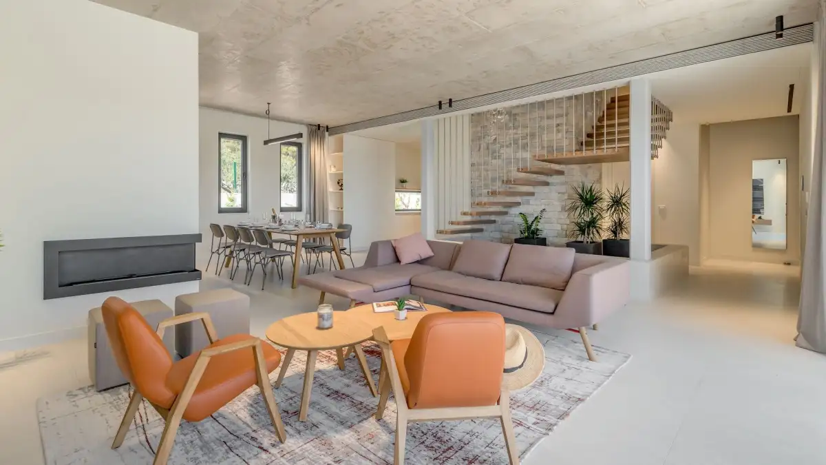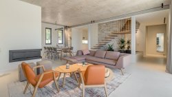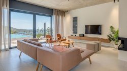 The villa is designed with an emphasis on clean lines, light and the connection between the interior and the exterior. On the ground floor there is an open living space, consisting of a fully equipped kitchen, dining room, spacious living room with fireplace and direct access to a generous terrace. The latter is equipped with an infinity pool, a sun terrace and a summer kitchen with barbecue - the perfect place for relaxation and evening gatherings with friends. The ground floor also includes a separate guest toilet, laundry room and storage room.
