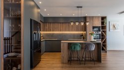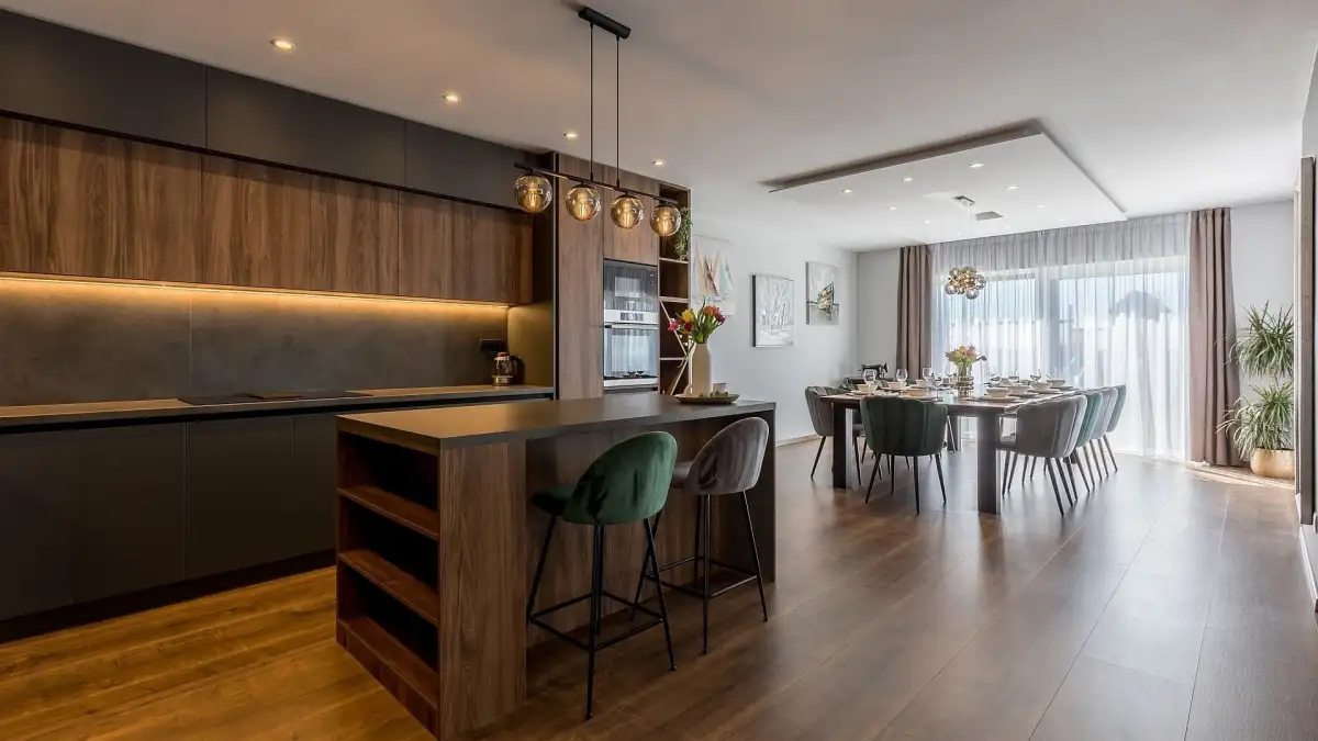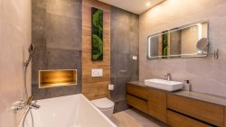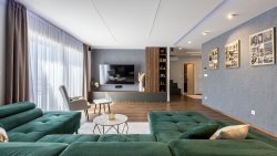 The exterior of the property consists of a landscaped fenced garden with a terrace, private pool, relaxation area, and children's playground. The property was built with an emphasis on the quality of the materials used and sustainability—the villa is equipped with solar panels and a rainwater collection system for garden irrigation. There is also a garage and ample parking spaces.