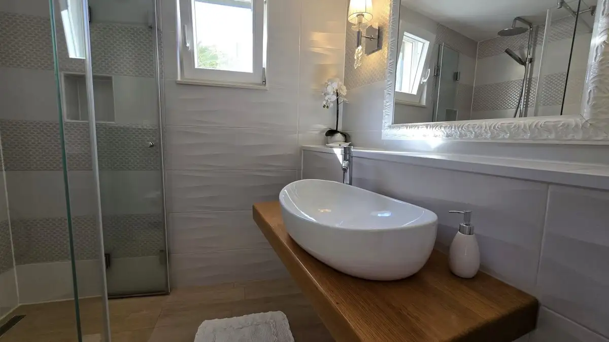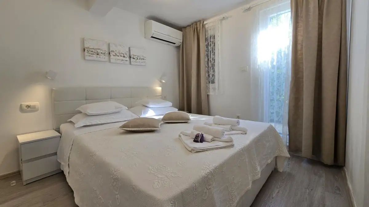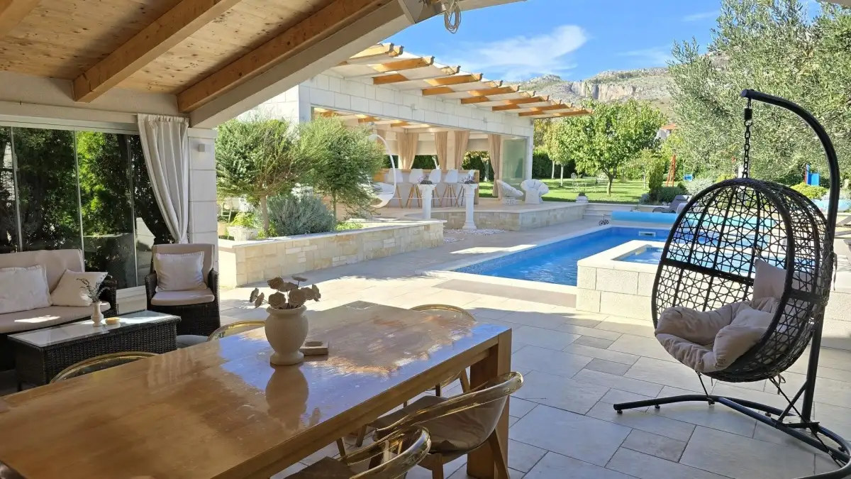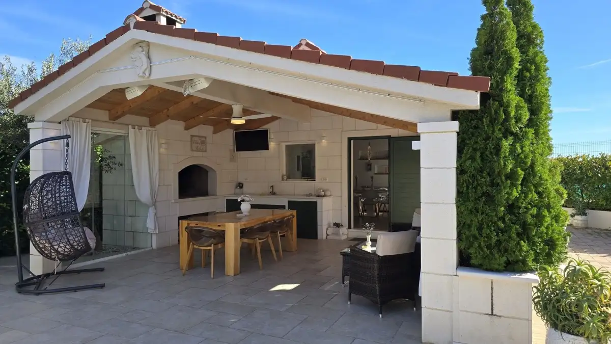 The property is located in a picturesque area near the famous historic town of Trogir, which is listed as a UNESCO World Heritage Site. This location is sought after for its excellent accessibility—Split International Airport is only 4 kilometers away, which is a huge advantage for travelers and potential visitors in terms of tourist rentals. The peaceful surroundings and natural environment ensure an undisturbed stay. The popular beach in the resort of Seget is just a 5-minute drive away. All amenities, restaurants, shops, and cultural attractions are within easy reach.