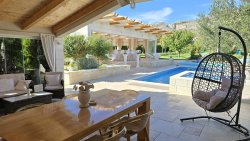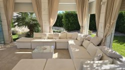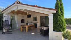 The house is divided into two floors. It has three comfortable bedrooms and a spacious living room connected to a fully equipped kitchen and dining room. The living area has direct access to a covered terrace, which flows seamlessly into the outdoor area with a swimming pool, hot tub, summer kitchen, and barbecue—all perfectly designed for relaxation and entertainment under the open sky.