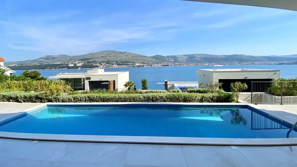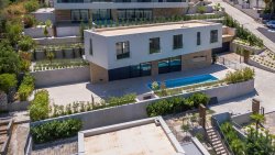 We are offering for sale a unique newly built modern villa with a heated pool and breathtaking sea views, located on the island of Čiovo in a peaceful and attractive area just a few steps from the coastline. Thanks to its position in the second row from the sea and the cascading terrain, the villa offers unobstructed panoramic sea views from all floors.