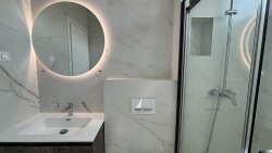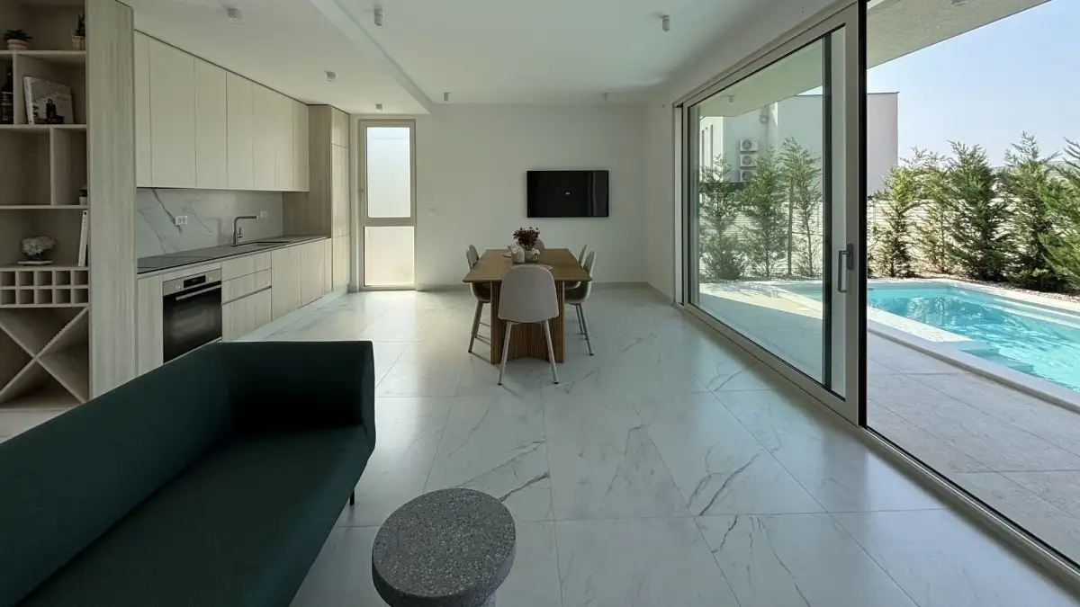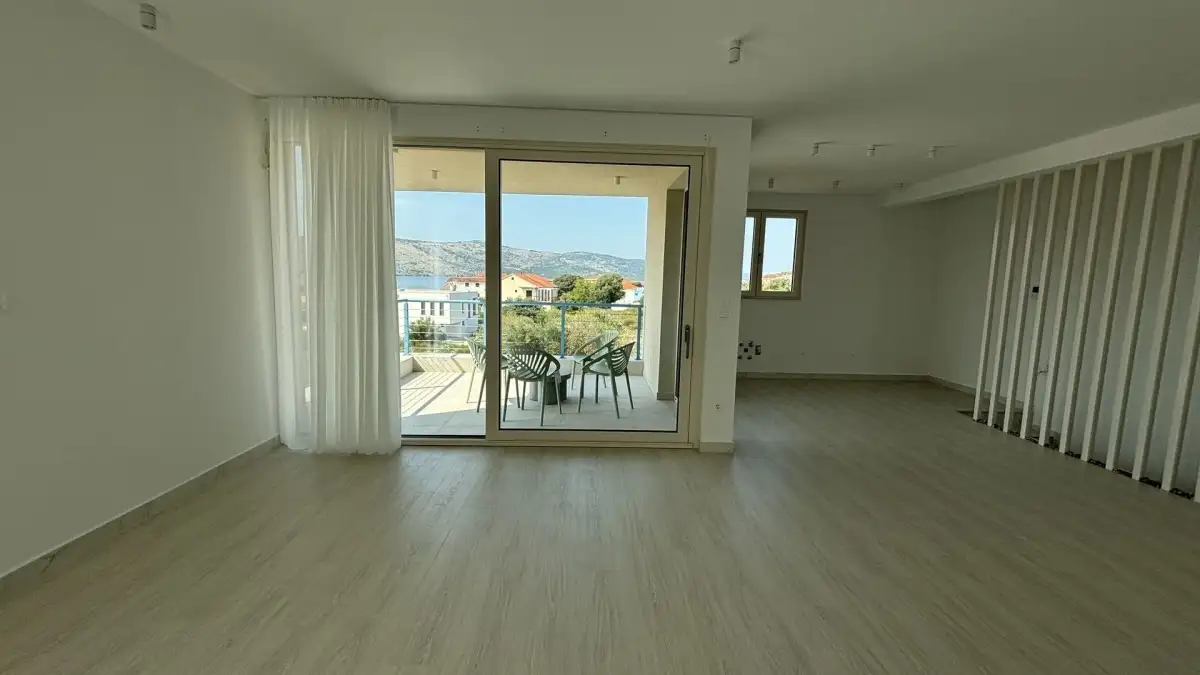 Newly built semi-detached villa with private pool for sale is located in a quiet location near Trogir, just 80 m from the sea. On a plot of 565 sqm there is a three-storey villa with a total living area of 200 sqm.