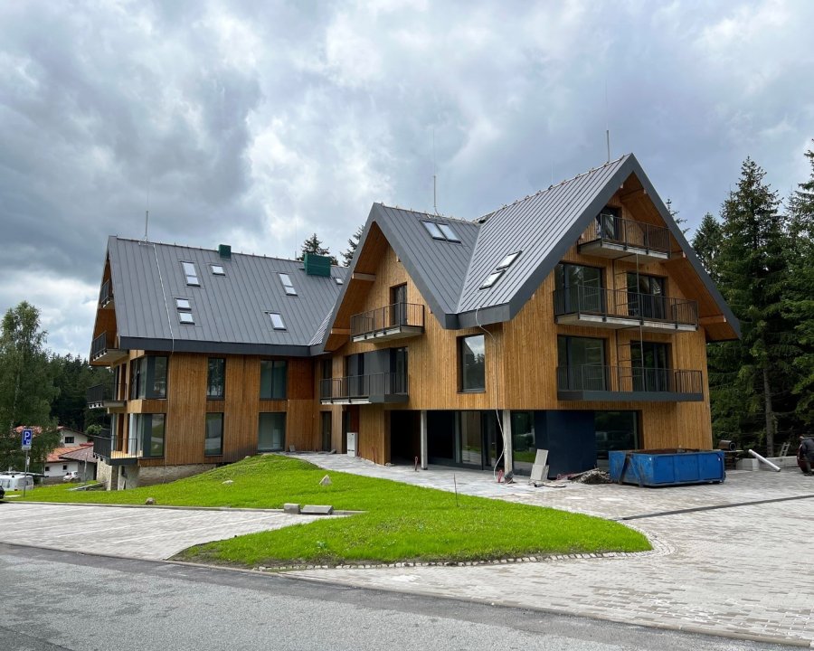 Apartmánový dům v Harrachově, jehož design vychází z tradiční architektury zdůrazňující charakter původních chalup, je zastřešen odolnou falcovanou střechou. Příjemný horský ráz mu dodává obložení fasády thermo borovicí a kamennými pásky z balkánské žuly.
