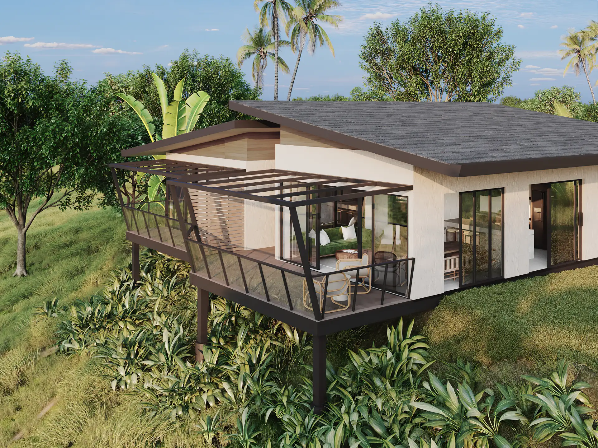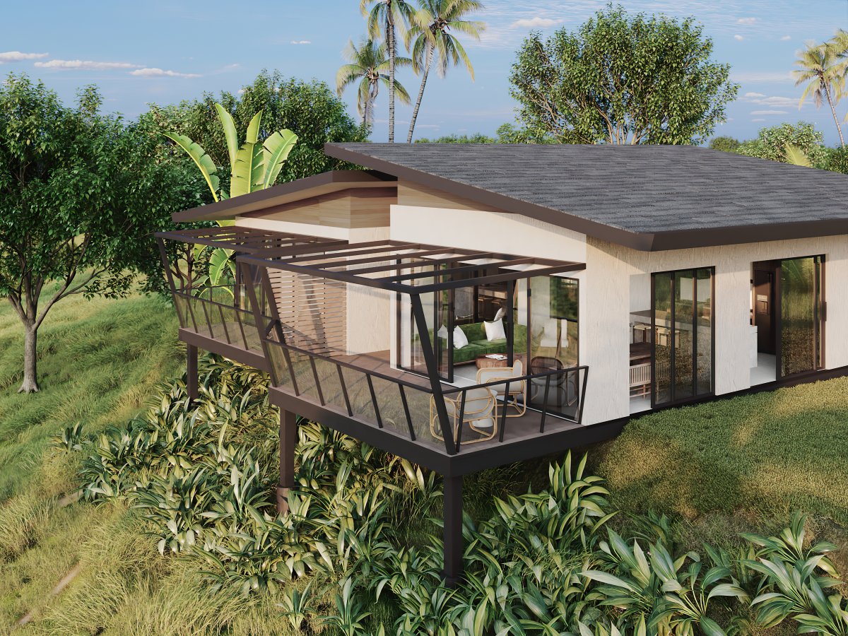 Vybírat lze z domů ve třech variantách – jedna, dvě nebo tři ložnice. Dispozice jsou variabilní a lze je podle přání upravovat. Společenská obývací část interiéru je oddělena praktickou vstupní chodbou od ložnic a koupelny. Přitažlivý a funkční minimalistický design domů pak doplňují rozsáhlé vlastní pozemky s pramenitou vodou, vzrostlými stromy a úrodnou zahradou, na které můžete sklízet vlastní tropické ovoce. Vedle příjemné atmosféry designového domu získáte tedy i své jedinečné bohaté zelené soukromí. Interiérovými materiály je dřevo a keramická dlažba, ale vybírat lze z mnoha druhů nadstandardních podlah z tropického dřeva.