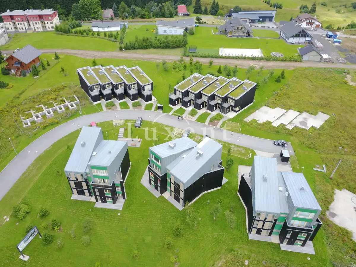 Domy obložené tmavým dřevem s velkými okny jsou postaveny podle moderních trendů architektury v souladu s přírodou a mají například zatravněné střechy, celý areál je uzavřený závorou a pro každého je k dispozici vlastní venkovní parkovací stání. Řadové domky i přízemní apartmány mají francouzská okna s volným přístupem do okolní přírody.