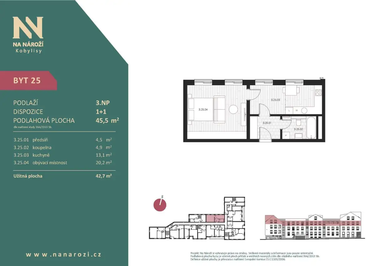 Tento byt 1+1 vznikne v projektu Na Nároží v pražských Kobylisích ve 3.NP moderního bytového domu v pěší dostupnosti metra. Podlahová plocha bytu je 45,5 m², celková plocha bytu činí 42,7 m². K bytu náleží sklep, který je započten v ceně.