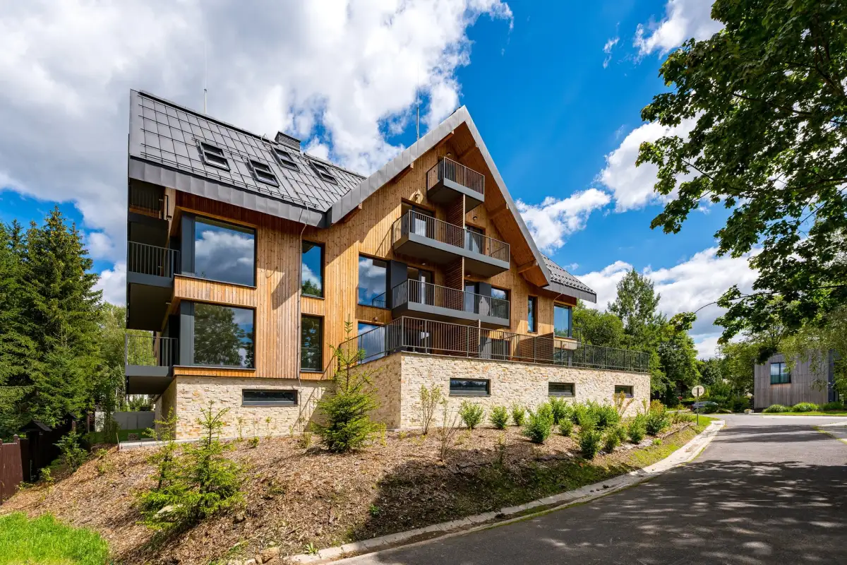 Harrachov Peaks je luxusní projekt vystavěný z kvalitních přírodních materiálů s wellness se saunou a vířivkou a plně vybaveným fitness. Představuje pouze 16 moderních apartmánů a nabízí tak komorní atmosféru v domě pro jejich majitele. Svým konceptem uspokojí zájemce jako o druhé bydlení v Krkonoších, tak investory se záměrem zajistit své finance nebo praktikovat výnosové krátkodobé pronájmy. Součástí nabídky je i správa apartmánů včetně pronájmů. Projekt HARRACHOV PEAKS nabízí vysoký standard vybavení – dubové podlahy, dřevěné terasy, velkoformátové obklady v koupelnách a na chodbách a další. Vytápění probíhá tepelnými čerpadly a je rozvedeno podlahovým topným systémem. V bytě je rekuperace. Energetická třída je velmi úspornou B. Kolaudace úspěšně proběhla a nastěhování je možné ihned.