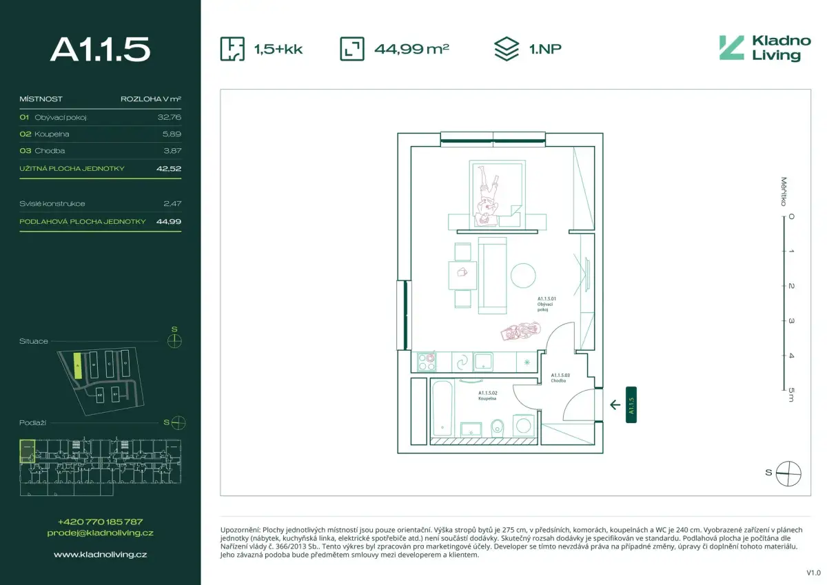 Nabízíme ke koupi moderní byt 1+kk (1,5+kk) o podlahové ploše 45 m² v rezidenčním projektu Kladno Living, který vzniká v jedné z nejatraktivnějších lokalit města Kladno – Kročehlavy. Tento nový developerský projekt představuje jedinečnou příležitost pro ty, kteří hledají nové byty v Kladně nebo investici do nemovitosti s vysokým potenciálem zhodnocení.