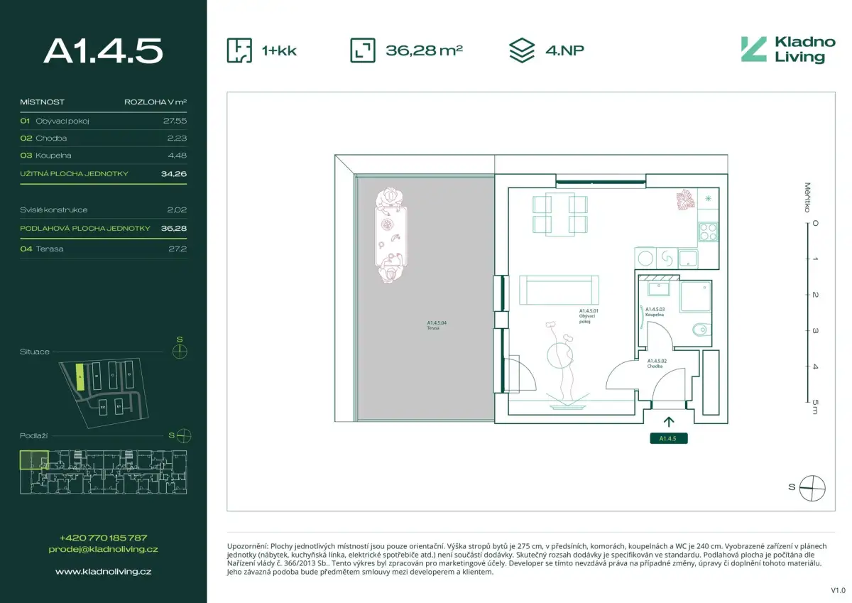 Nabízíme ke koupi moderní byt 1+kk o podlahové ploše 36,3 m² s terasou 27,2 m² v rezidenčním projektu Kladno Living, který vzniká v jedné z nejatraktivnějších lokalit města Kladno – Kročehlavy. Tento nový developerský projekt představuje jedinečnou příležitost pro ty, kteří hledají nové byty v Kladně nebo investici do nemovitosti s vysokým potenciálem zhodnocení.