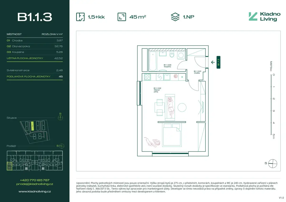 Nabízíme ke koupi moderní byt 1+kk o podlahové ploše 45 m² v rezidenčním projektu Kladno Living, který vzniká v jedné z nejatraktivnějších lokalit města Kladno – Kročehlavy. Tento nový developerský projekt představuje jedinečnou příležitost pro ty, kteří hledají nové byty v Kladně nebo investici do nemovitosti s vysokým potenciálem zhodnocení.