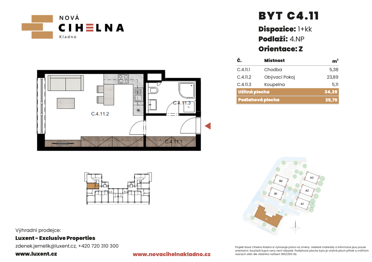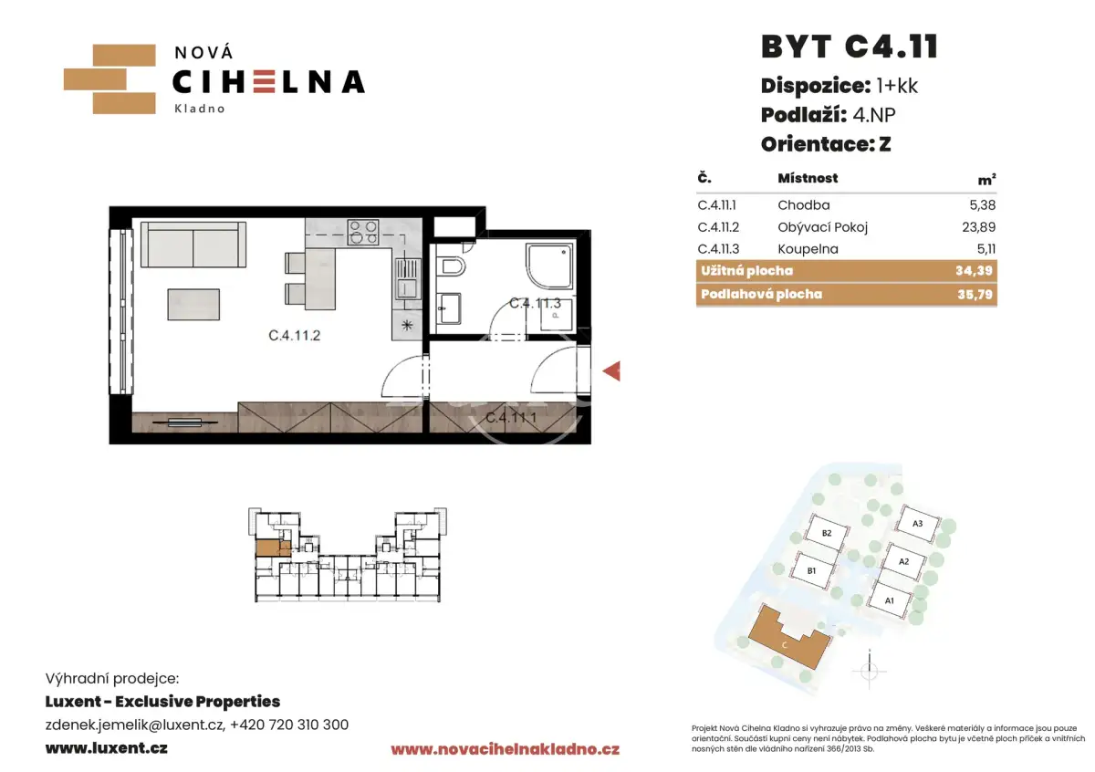 Nabízíme k prodeji byt 1+kk o podlahové ploše 35,79 m² v mimořádně úsporném developerském projektu Nová Cihelna Kladno vznikajícím v městské čtvrti Kladno – Rozdělov.
