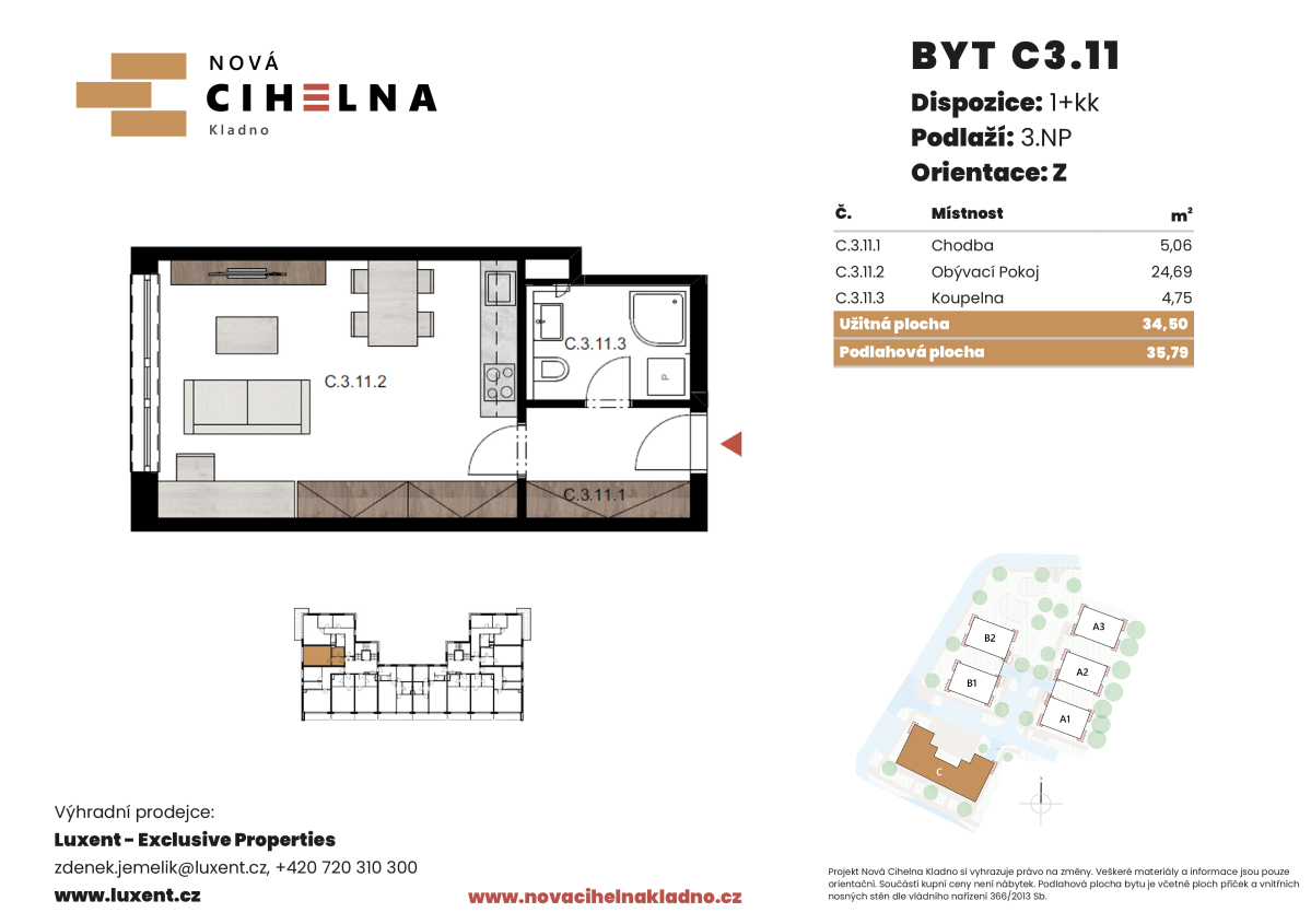 Nabízíme k prodeji byt 1+kk o podlahové ploše 35,79 m² v mimořádně úsporném developerském projektu Nová Cihelna Kladno vznikajícím v městské čtvrti Kladno – Rozdělov.