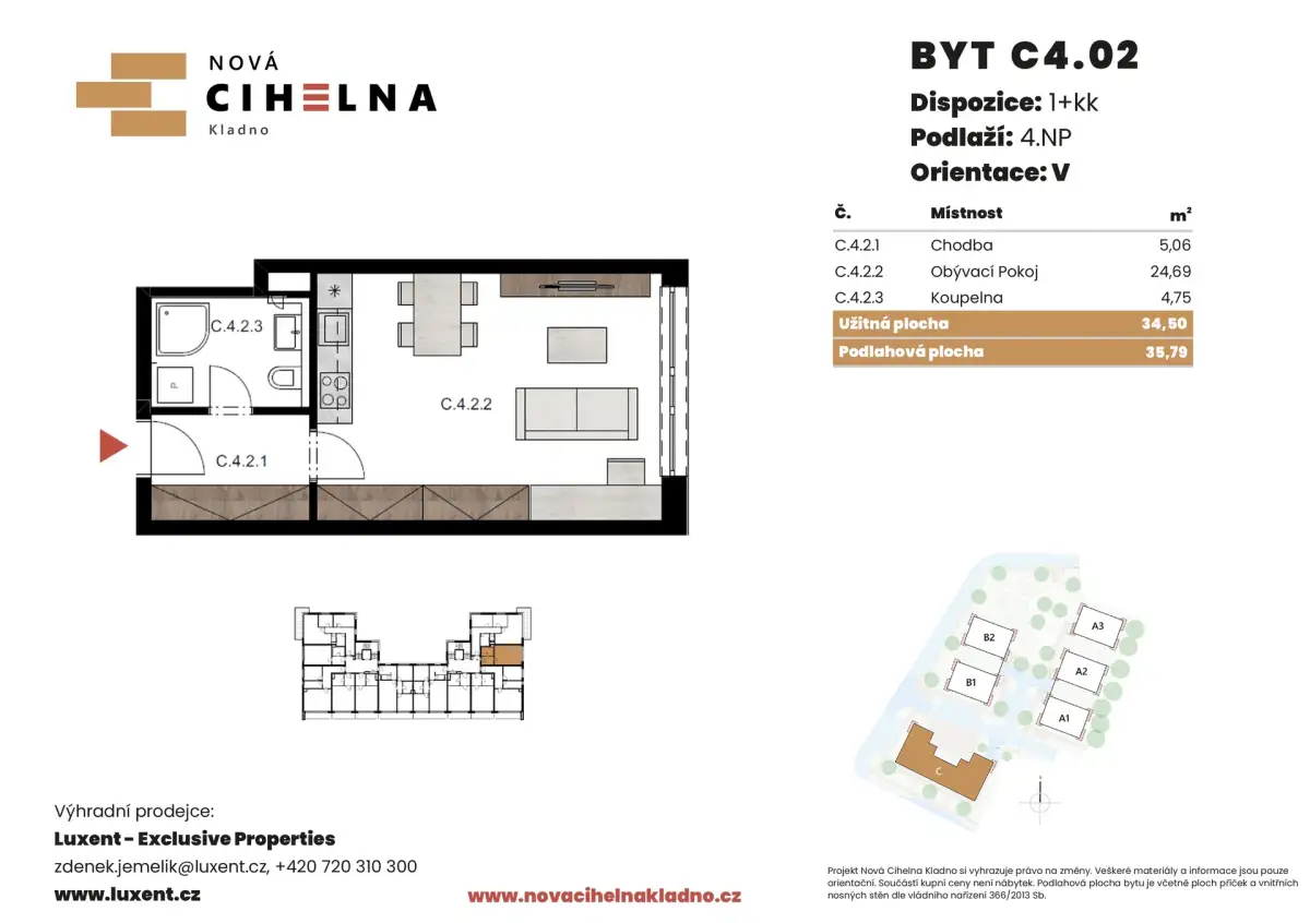 Nabízíme k prodeji byt 1+kk o podlahové ploše 35,79 m² v mimořádně úsporném developerském projektu Nová Cihelna Kladno vznikajícím v městské čtvrti Kladno – Rozdělov.