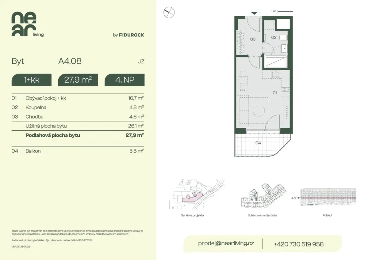 Nabízíme k prodeji byt 1+kk o podlahové ploše 27,9 m² s balkonem 5,5 m² v developerském projektu NEAR living v Praze 8, vznikajícím na pomezí Palmovky a Karlína.