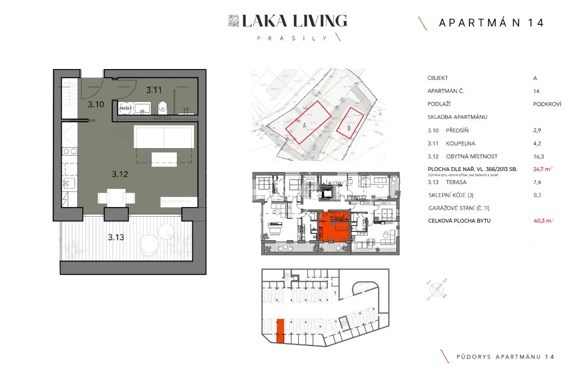 Nabízíme k prodeji luxusní horský apartmán o dispozici 1+kk o obytné ploše 23,4 m² a podlahové ploše 24,7 m² s terasou o velikosti 7,4 m². Byt se nachází v podkroví apartmánového domu „A“ v nově vznikajícím developerském projektu LAKA LIVING na Šumavě. Apartmán je orientován na JV stranu. Byt se skládá z obytné místnosti (16,3 m²), koupelny se sprchou a toaletou (4,2 m²) a předsíně (2,9 m²).