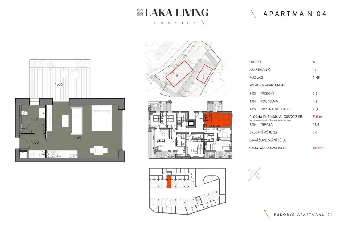 Nabízíme k prodeji luxusní horský apartmán o dispozici 1+kk o obytné ploše 30,5 m² a podlahové ploše 31,8 m² s terasou o velikosti 11,4 m². Byt se nachází v 1. nadzemním podlaží apartmánového domu „A“ v nově vznikajícím developerském projektu LAKA LIVING na Šumavě. Apartmán je orientován na SZ stranu. Byt se skládá z obytné místnosti (23 m²), koupelny se sprchou a toaletou (4,2 m²) a předsíně (3,3 m²).