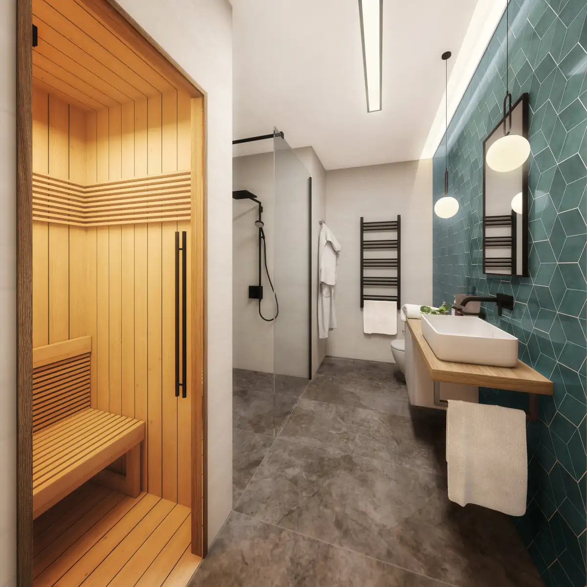 Součástí bytového komplexu je i fitness a wellness s vířivkou a saunou.
