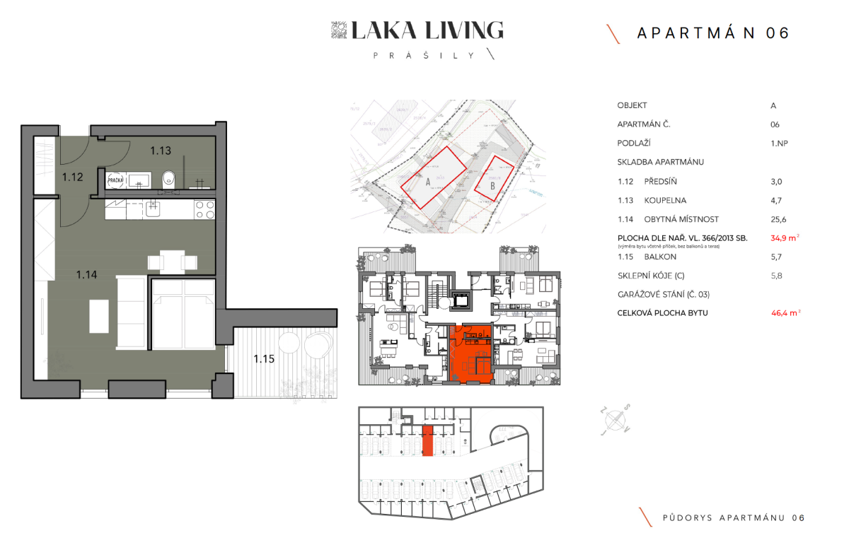 Nabízíme k prodeji luxusní horský apartmán o dispozici 1+kk o obytné ploše 33,3 m² a podlahové ploše 34,9 m² s balkonem o velikosti 5,7 m². Byt se nachází v 1. nadzemním podlaží apartmánového domu „A“ v nově vznikajícím developerském projektu LAKA LIVING na Šumavě. Apartmán je orientován na JV stranu. Byt se skládá z obytné místnosti (25,6 m²), koupelny se sprchou a toaletou (4,7 m²) a předsíně (3 m²).