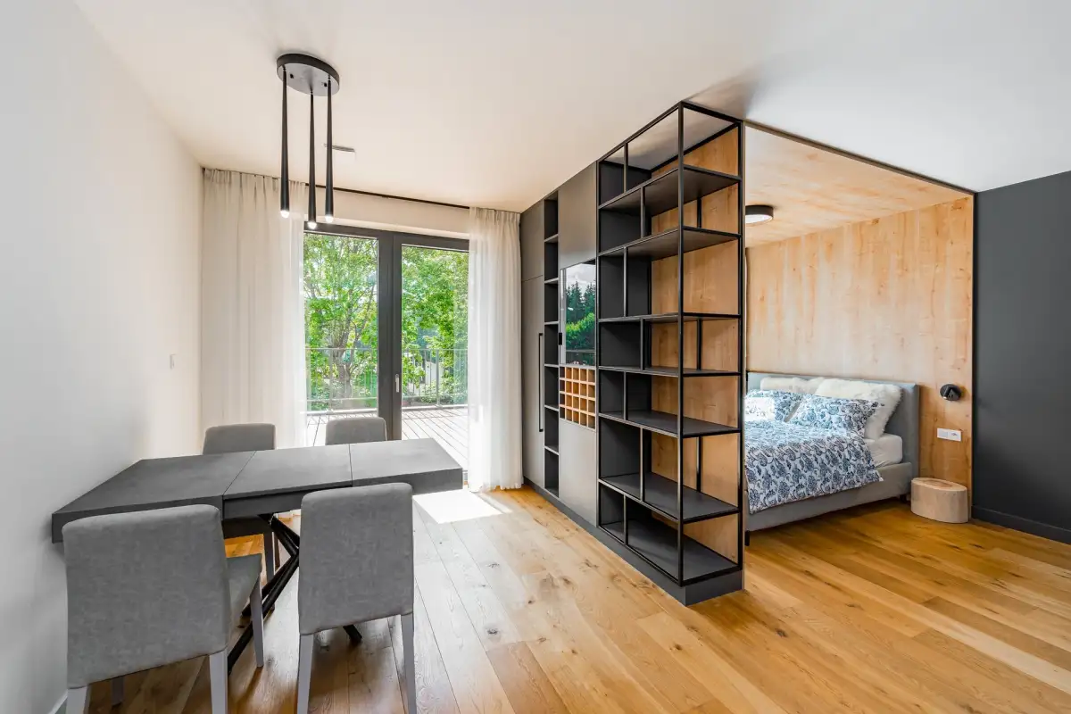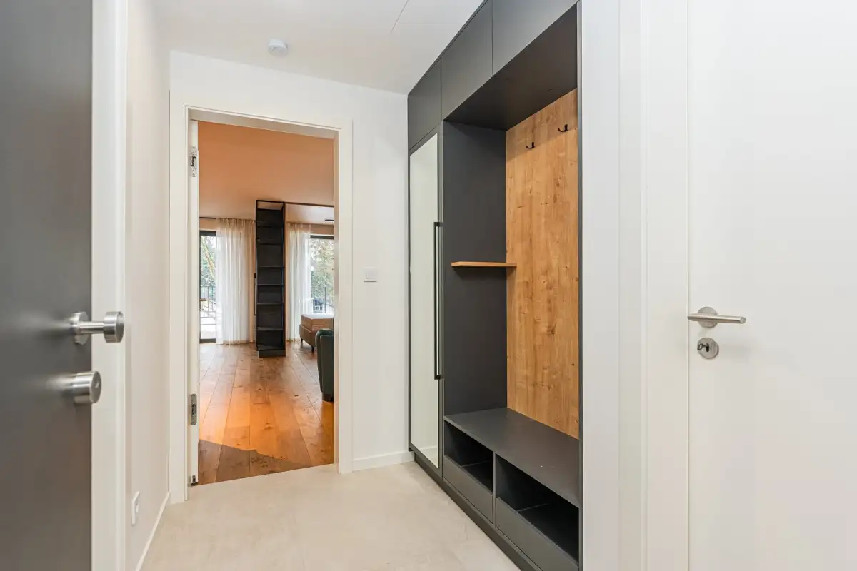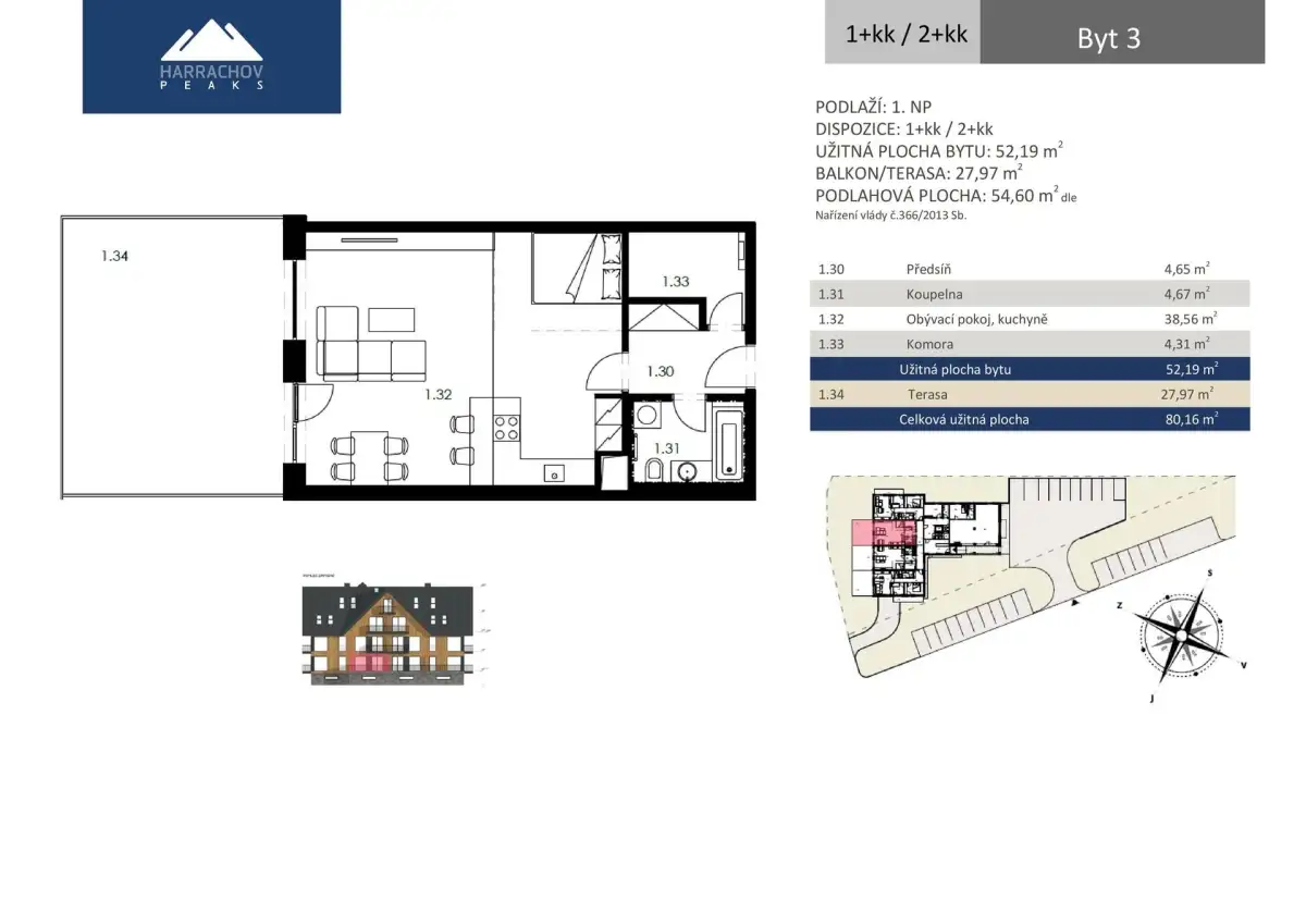 Nabízíme plně vybavený apartmán o dispozici 1-2+kk v 1.NP luxusního projektu HARRACHOV PEAKS. Apartmán má obytnou plochu 52,19 m² a celkovou užitnou plochu 80,16 m² vč. prostorné terasy (27,97 m²). Projekt je dokončen a zkolaudován a byt je jako vzorový vybaven zařízenou kuchyní (spotřebiče BEKO) a skříňovou vestavbou oddělující spací a jídelní kout, která apartmán přibližuje dispozici 2+kk. Rovněž chodba je vybavena vestavěnou skříní a komorou. V suterénu je majitelům apartmánů k dispozici wellness se saunou a vířivkou a vybavené fitness.