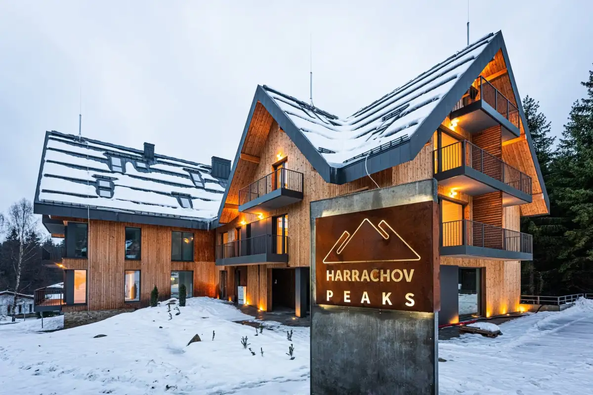 Harrachov Peaks je luxusní projekt vystavěný z kvalitních přírodních materiálů s wellness se saunou a vířivkou a plně vybaveným fitness. Představuje pouze 16 moderních apartmánů a nabízí tak komorní atmosféru v domě pro jejich majitele. Svým konceptem uspokojí zájemce jako o druhé bydlení v Krkonoších, tak investory se záměrem zajistit své finance nebo praktikovat výnosové krátkodobé pronájmy. Součástí nabídky je i správa apartmánů včetně pronájmů. Projekt HARRACHOV PEAKS nabízí vysoký standard vybavení – dubové podlahy, dřevěné terasy, velkoformátové obklady v koupelnách a na chodbách a další. Vytápění probíhá tepelnými čerpadly a je rozvedeno podlahovým topným systémem. V bytě je rekuperace. Energetická třída je velmi úspornou B.