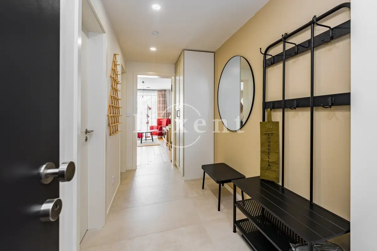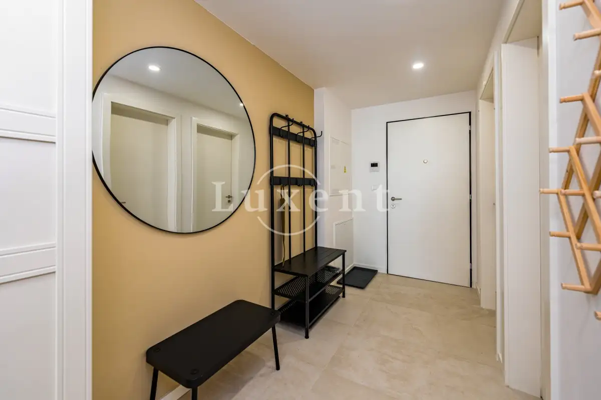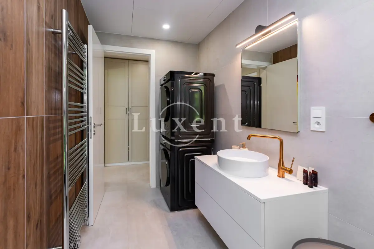 Apartmán je vybaven špičkovými spotřebiči značek renomovaných výrobců – vestavěná lednice, trouba, indukční varná deska, myčka, pračka, sušička, TV a veškerý nábytek s dekoracemi v elegantním stylu. Použité materiály reprezentují nejvyšší standardy kvality - luxusní dubové podlahy, velkoformátové keramické obklady, designové baterie Grohe, sanitární keramika Laufen, bezfalcové interiérové dveře a dřevěná balkonová prkna. Komfortní podlahové vytápění zajišťuje moderní tepelné čerpadlo vzduch-voda, přičemž vzduchotechniku doplňuje lokální rekuperační jednotka diskrétně umístěná v předsíni. Energetická náročnost nemovitosti je zařazena do velmi úsporné třídy B.