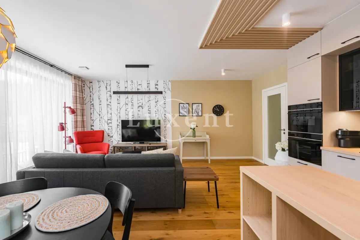 Interiér apartmánu zahrnuje prostornou předsíň, komfortní ložnici (11,5 m2), samostatnou toaletu, koupelnu se sprchovým koutem a reprezentativní obývací pokoj s kuchyní (30,1 m2), z něhož je přímý vstup na soukromý balkon s nádherným výhledem a příjemným posezením. Součástí je také vyhrazené garážové stání a sklepní kóje. Projekt nabízí nadstandardní vybavení včetně wellness centra se saunou a vířivkou a fitness centrum.