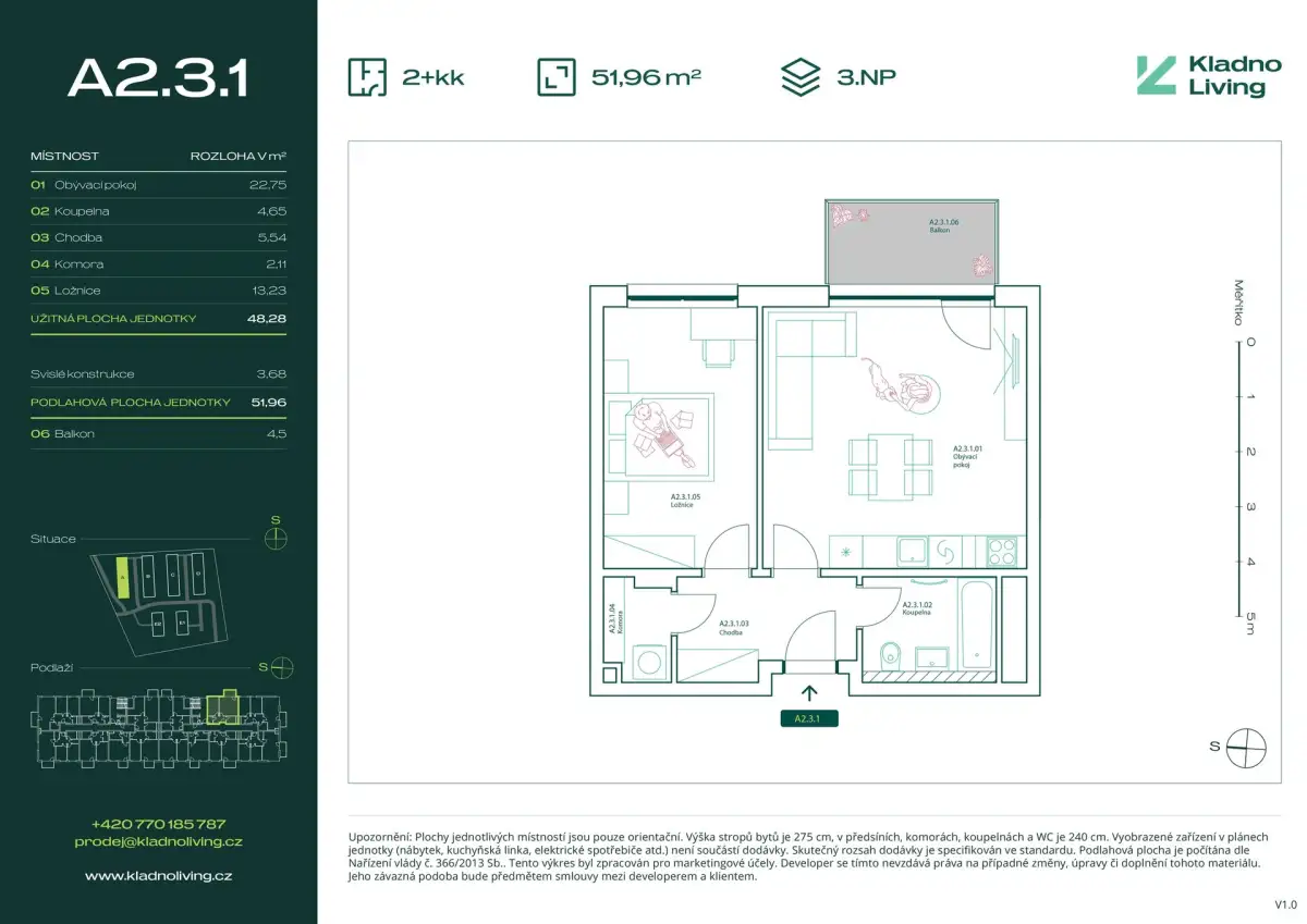 Nabízíme ke koupi moderní byt 2+kk o podlahové ploše 52 m² s balkonem 4,5 m² v rezidenčním projektu Kladno Living, který vzniká v jedné z nejatraktivnějších lokalit města Kladno – Kročehlavy. Tento nový developerský projekt představuje jedinečnou příležitost pro ty, kteří hledají nové byty v Kladně nebo investici do nemovitosti s vysokým potenciálem zhodnocení.