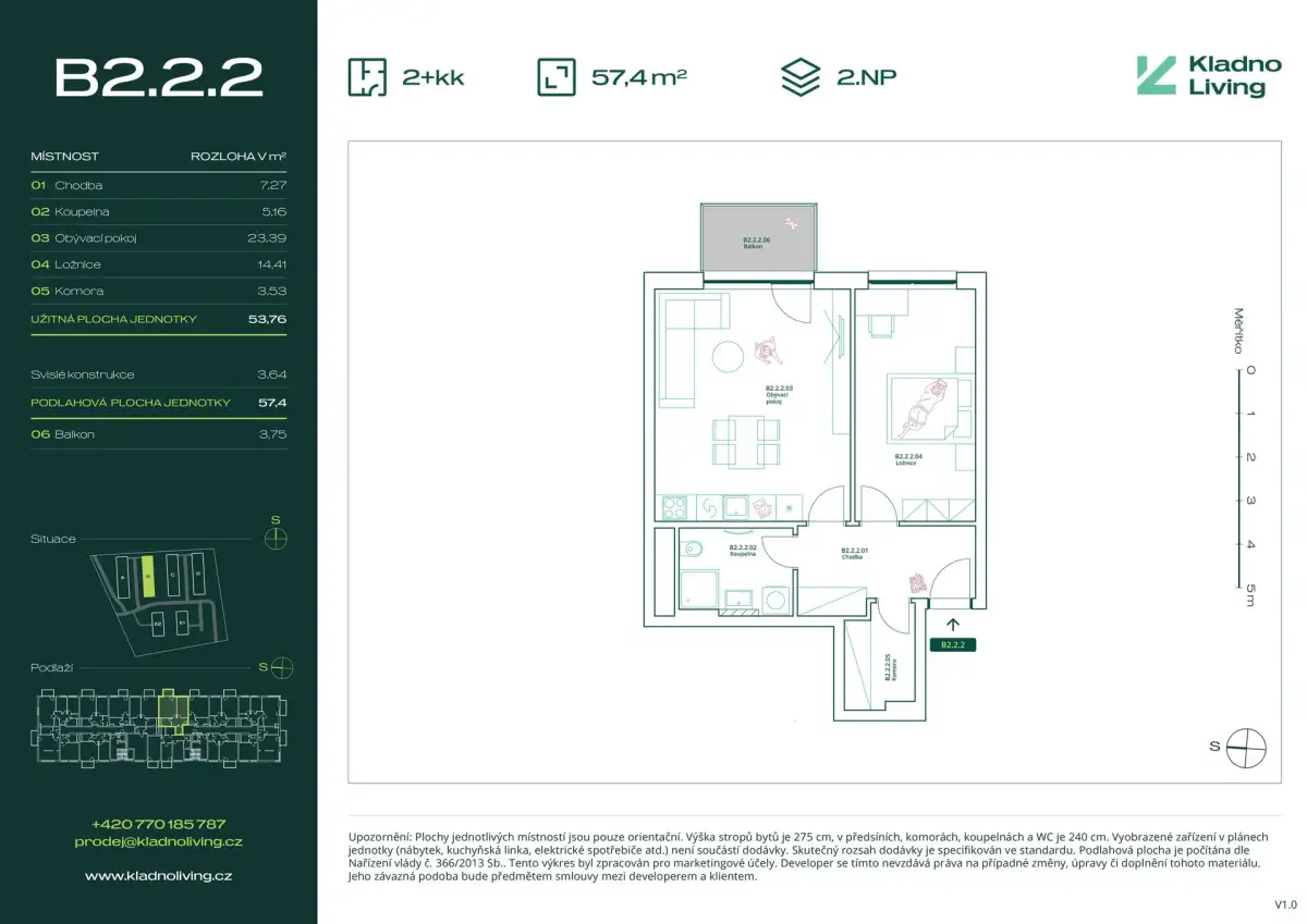 Nabízíme ke koupi moderní byt 2+kk o podlahové ploše 57,4 m² s balkonem 3,8 m² v rezidenčním projektu Kladno Living, který vzniká v jedné z nejatraktivnějších lokalit města Kladno – Kročehlavy. Tento nový developerský projekt představuje jedinečnou příležitost pro ty, kteří hledají nové byty v Kladně nebo investici do nemovitosti s vysokým potenciálem zhodnocení.