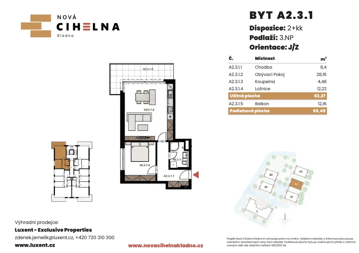 Nabízíme k prodeji byt 3+kk o podlahové ploše 55,49 m² s balkonem 12,15 m² v mimořádně úsporném developerském projektu Nová Cihelna Kladno vznikajícím v městské čtvrti Kladno – Rozdělov.