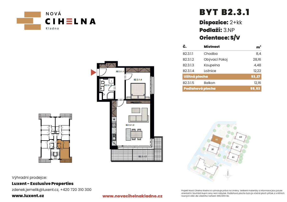 Nabízíme k prodeji byt 3+kk o podlahové ploše 55,53 m² s balkonem 12,16 m² v mimořádně úsporném developerském projektu Nová Cihelna Kladno vznikajícím v městské čtvrti Kladno – Rozdělov.