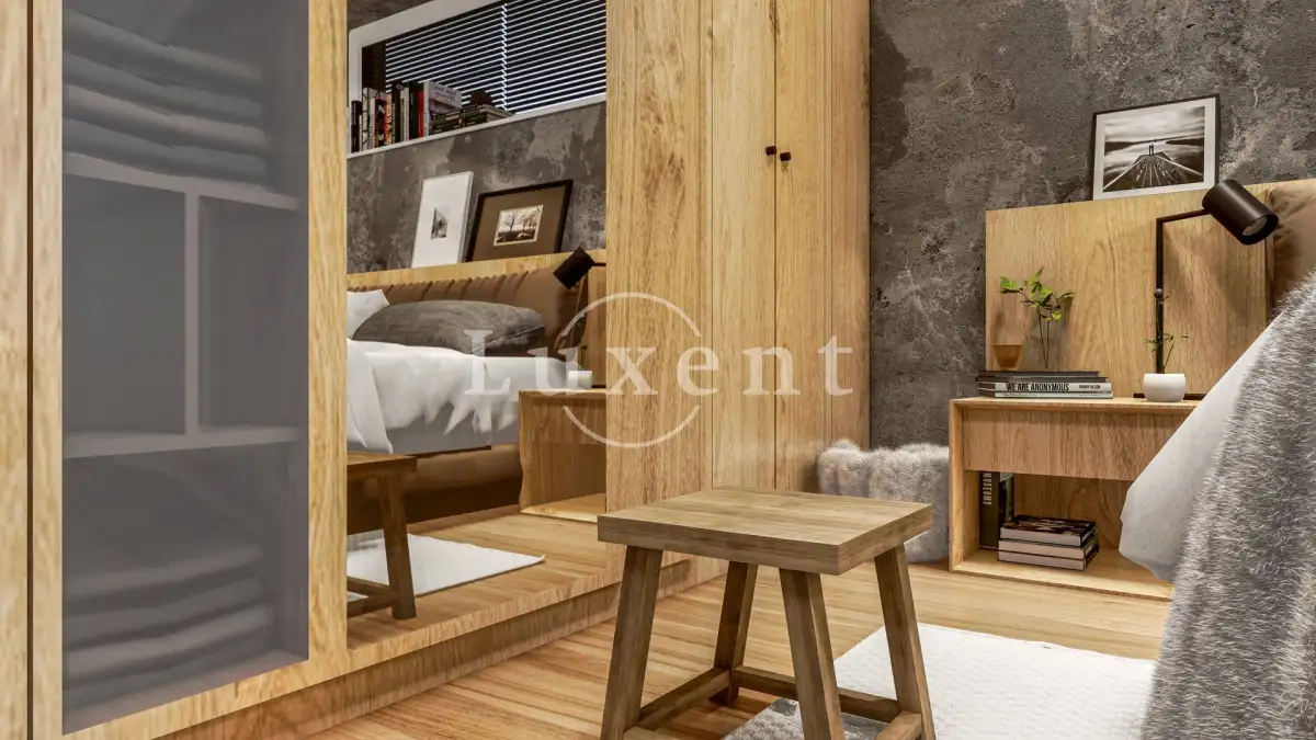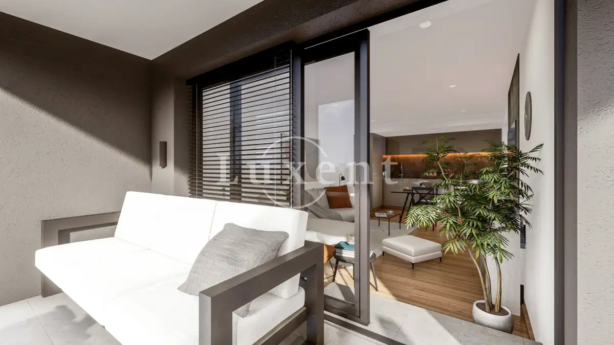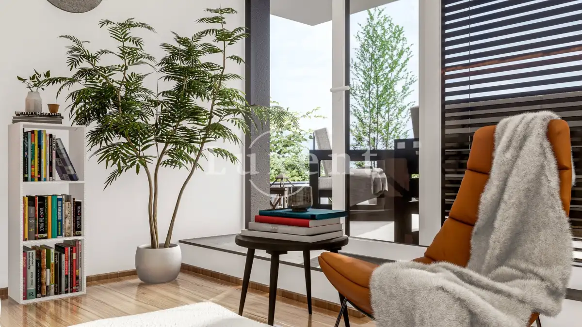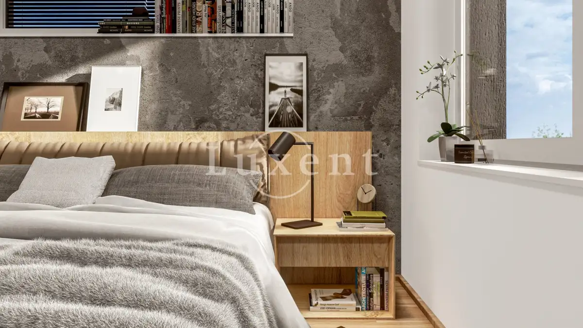 Byt je o dispozici 2+kk s terasou a situován je v 1. patře domu. Celková užitná plocha čítá 54,76 m2 plus 15,4 m2 terasy orientované na Z. Dispozice bytu je velmi praktická, všechny místnosti mají samostatný vstup. Ze zádveří s úložným prostorem se vstupuje do koupelny se sprchovým koutem a prostorem pro pračku a sušičku. Dále je zde obývací pokoj s přípravou pro kuchyň a výstupem na prostornou terasu. K obývacímu pokoji je připojena ještě jedna menší místnost, která může sloužit jako sklad nebo jako malá pracovna či šatna. V ložnici je prostor pro vestavěnou skříň nebo menší pracovní místo.