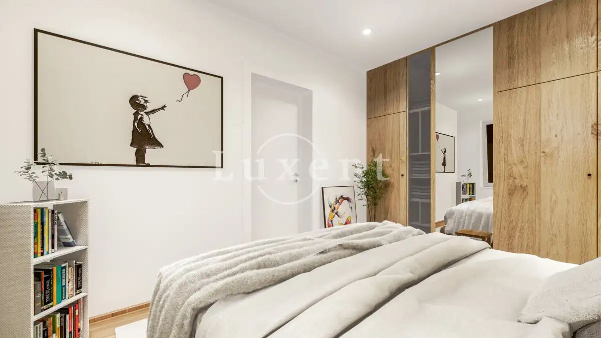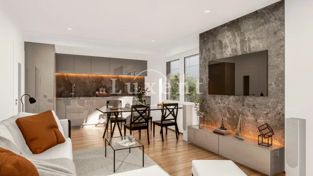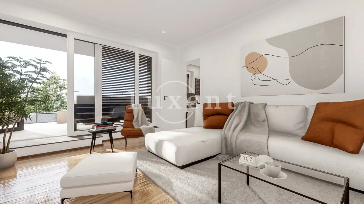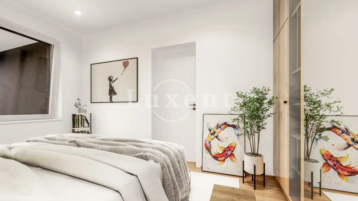 Byt je o dispozici 2+kk s terasou a situován je v 1. patře domu. Celková užitná plocha čítá 54,76 m2 plus 15,4 m2 terasy orientované na Z. Dispozice bytu je velmi praktická, všechny místnosti mají samostatný vstup. Ze zádveří s úložným prostorem se vstupuje do koupelny se sprchovým koutem a prostorem pro pračku a sušičku. Dále je zde obývací pokoj s přípravou pro kuchyň a výstupem na prostornou terasu. K obývacímu pokoji je připojena ještě jedna menší místnost, která může sloužit jako sklad nebo jako malá pracovna či šatna. V ložnici je prostor pro vestavěnou skříň nebo menší pracovní místo.