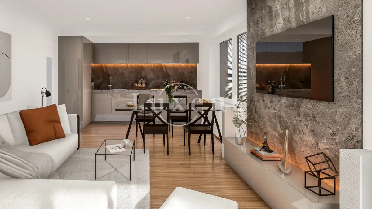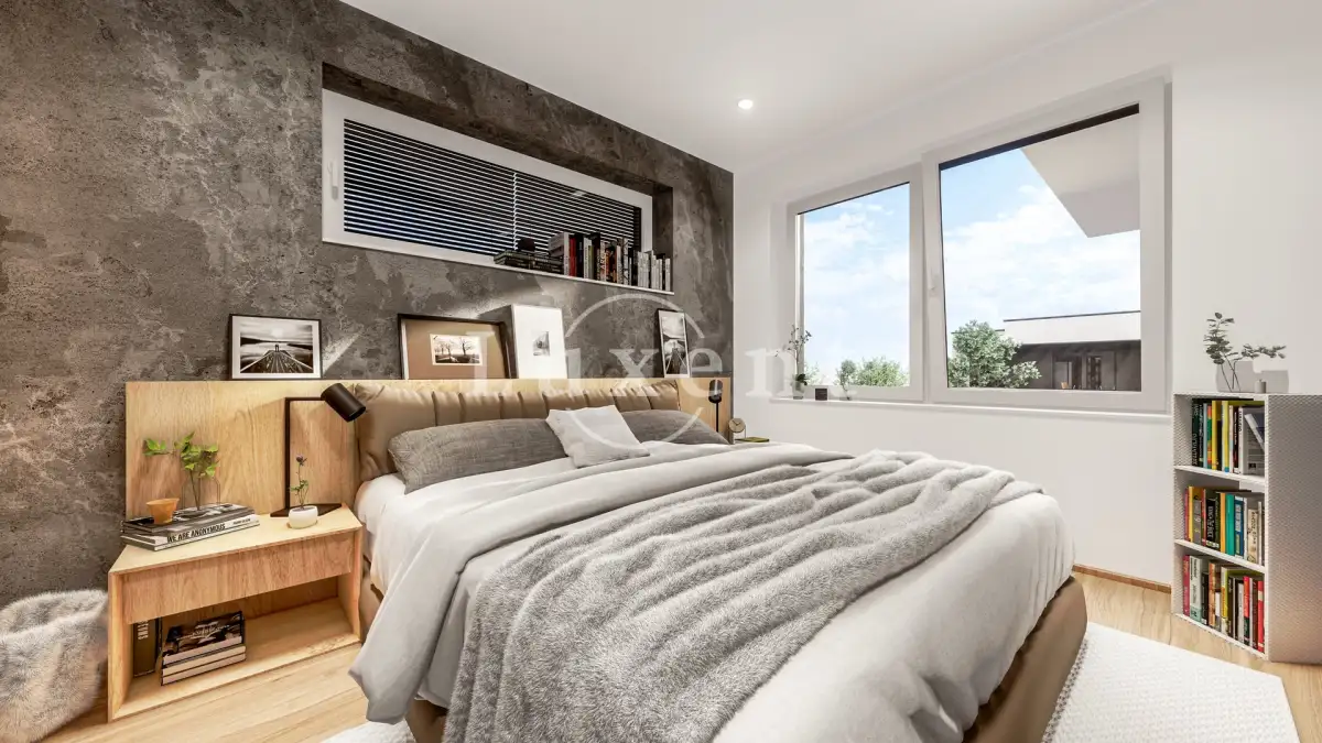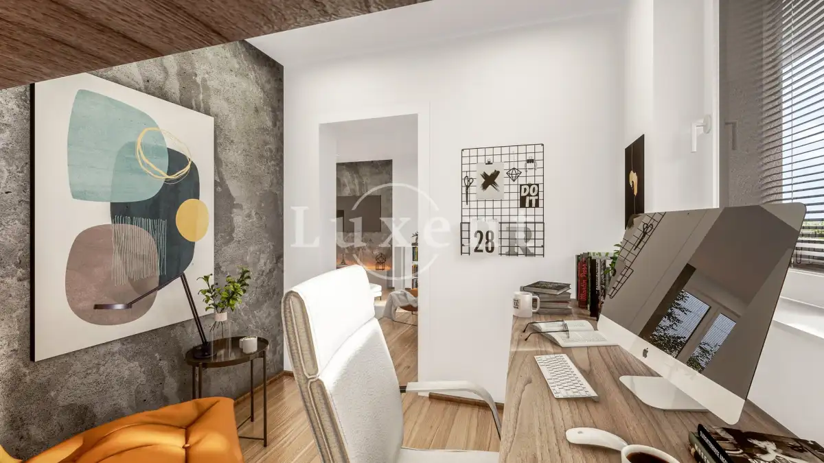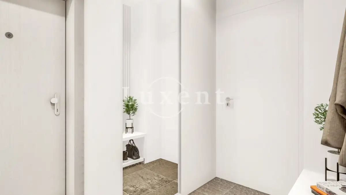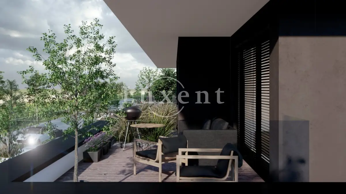 Byt je o dispozici 2+kk s terasou a situován je v 1. patře domu. Celková užitná plocha čítá 54,76 m2 plus 15,4 m2 terasy orientované na Z. Dispozice bytu je velmi praktická, všechny místnosti mají samostatný vstup. Ze zádveří s úložným prostorem se vstupuje do koupelny se sprchovým koutem a prostorem pro pračku a sušičku. Dále je zde obývací pokoj s přípravou pro kuchyň a výstupem na prostornou terasu. K obývacímu pokoji je připojena ještě jedna menší místnost, která může sloužit jako sklad nebo jako malá pracovna či šatna. V ložnici je prostor pro vestavěnou skříň nebo menší pracovní místo.