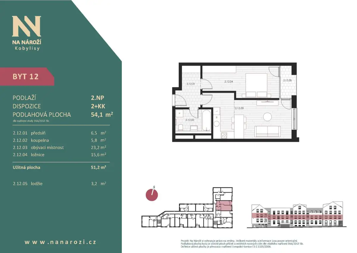 Tento byt 2+kk vznikne v projektu Na Nároží v pražských Kobylisích ve 2.NP moderního bytového domu v pěší dostupnosti metra. Podlahová plocha bytu je 54,1 m², celková plocha bytu včetně lodžie (3,2 m²) činí 54,4 m². K bytu náleží sklep, který je započten v ceně.
