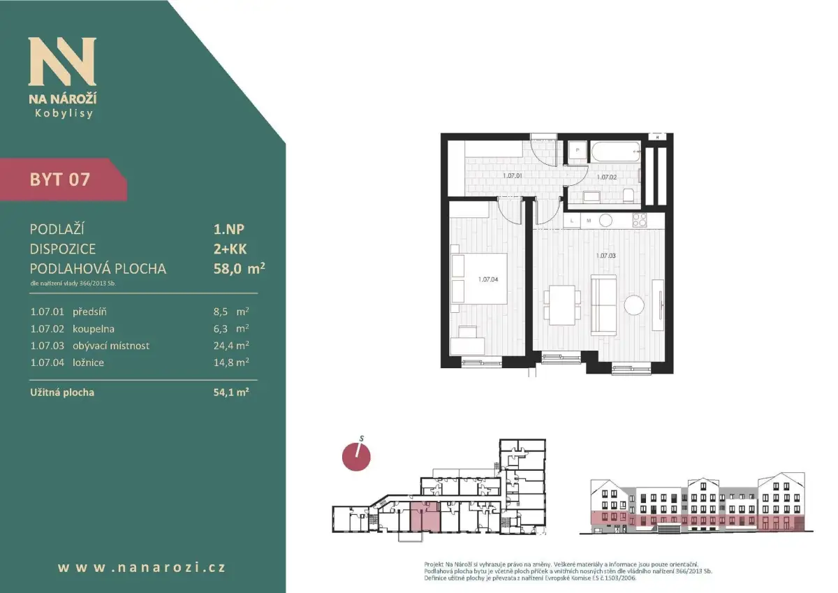 Tento byt 2+kk vznikne v projektu Na Nároží v pražských Kobylisích v 1.NP moderního bytového domu v pěší dostupnosti metra. Podlahová plocha bytu je 58 m², celková plocha bytu činí 54,1 m². K bytu náleží sklep, který je započten v ceně.