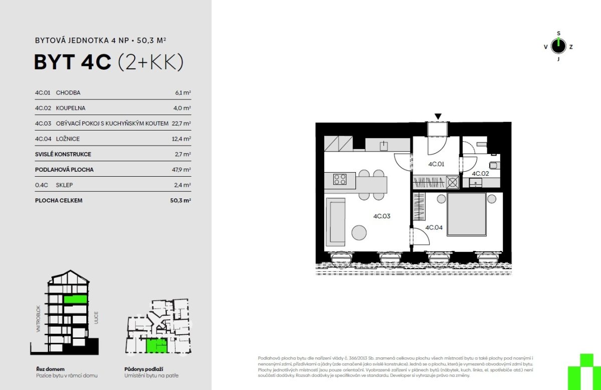 Plocha jednotky celkem činí 50,3 m², byt je navržen ve vysokém standardu. Obytný prostor doplňuje dřevěná podlaha FREVINI MONACO, pokládaná ve vzoru chevron. Interiérové dveře kombinují klasické dřevěné prvky s ocelovými skleněnými dveřmi se strukturovaným a čirým sklem, čímž podtrhují moderní charakter prostoru. K bytu náleží sklep.