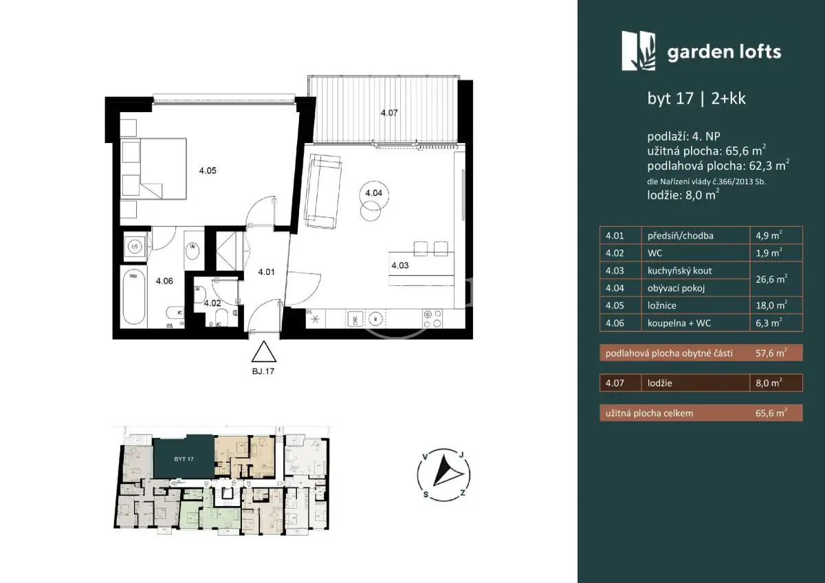 Nabízíme k prodeji designový byt 2+kk o obytné ploše 57,7 m2 s lodžií 7,98 m2 v unikátním developerském projektu Garden Lofts v ulici Pechlátova, Praha 5.