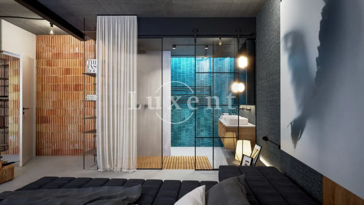 Byt je situován ve 4. NP novostavby, interiér zahrnuje předsíň, prostorný obývací pokoj s kuchyňským koutem, ložnici, koupelnu s vanou a samostatně oddělenou toaletu. Z obývací části je vstup na lodžii. K bytu náleží parkovací stání v podzemních garážích a zděný sklep. Součástí bytu je klimatizace.