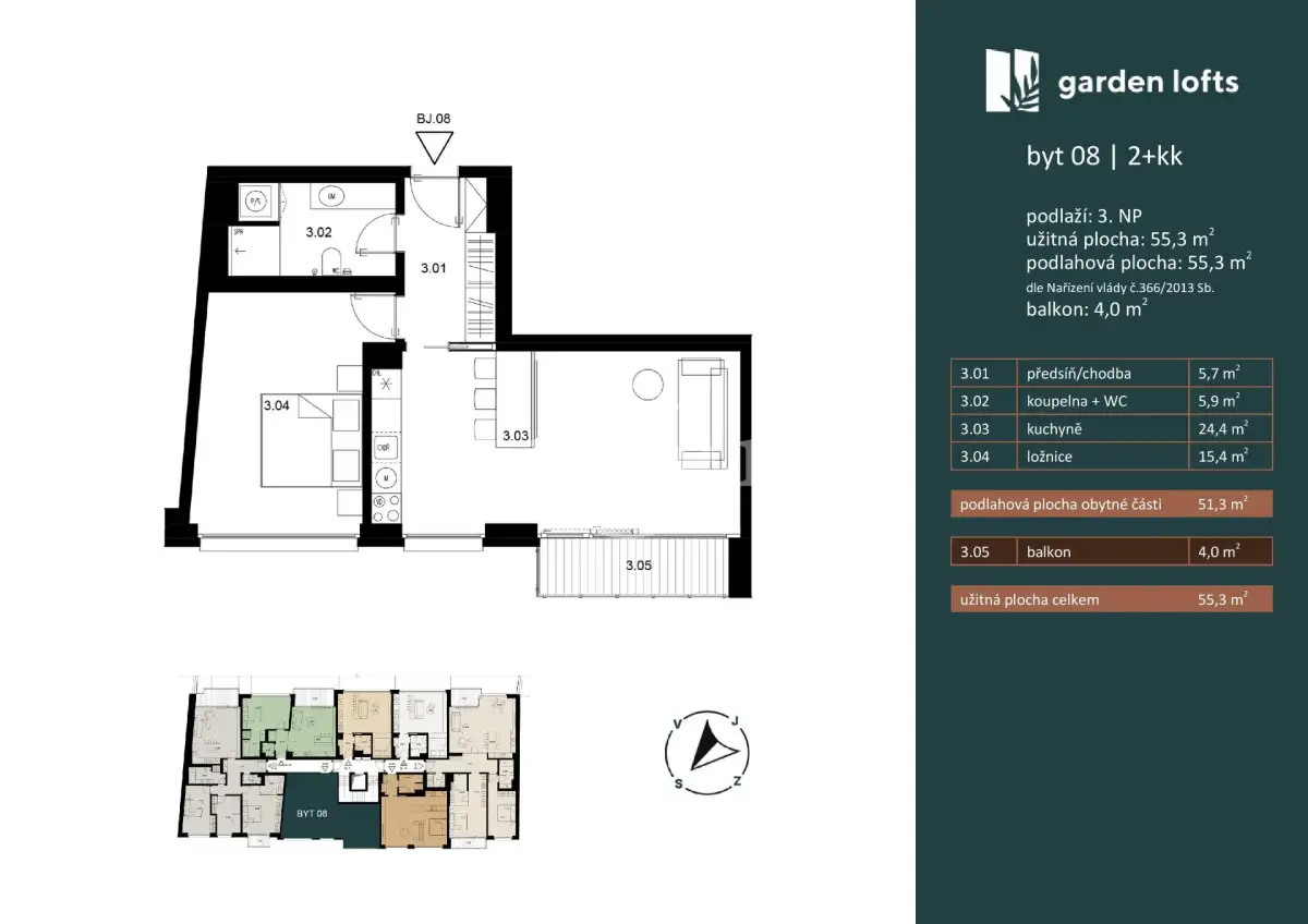| GL-01 | 2+kk | 1. patro | 55 m2 | 51 m2 | Ne / 4 m2 / Ne | Ne | Prodáno | Detail |