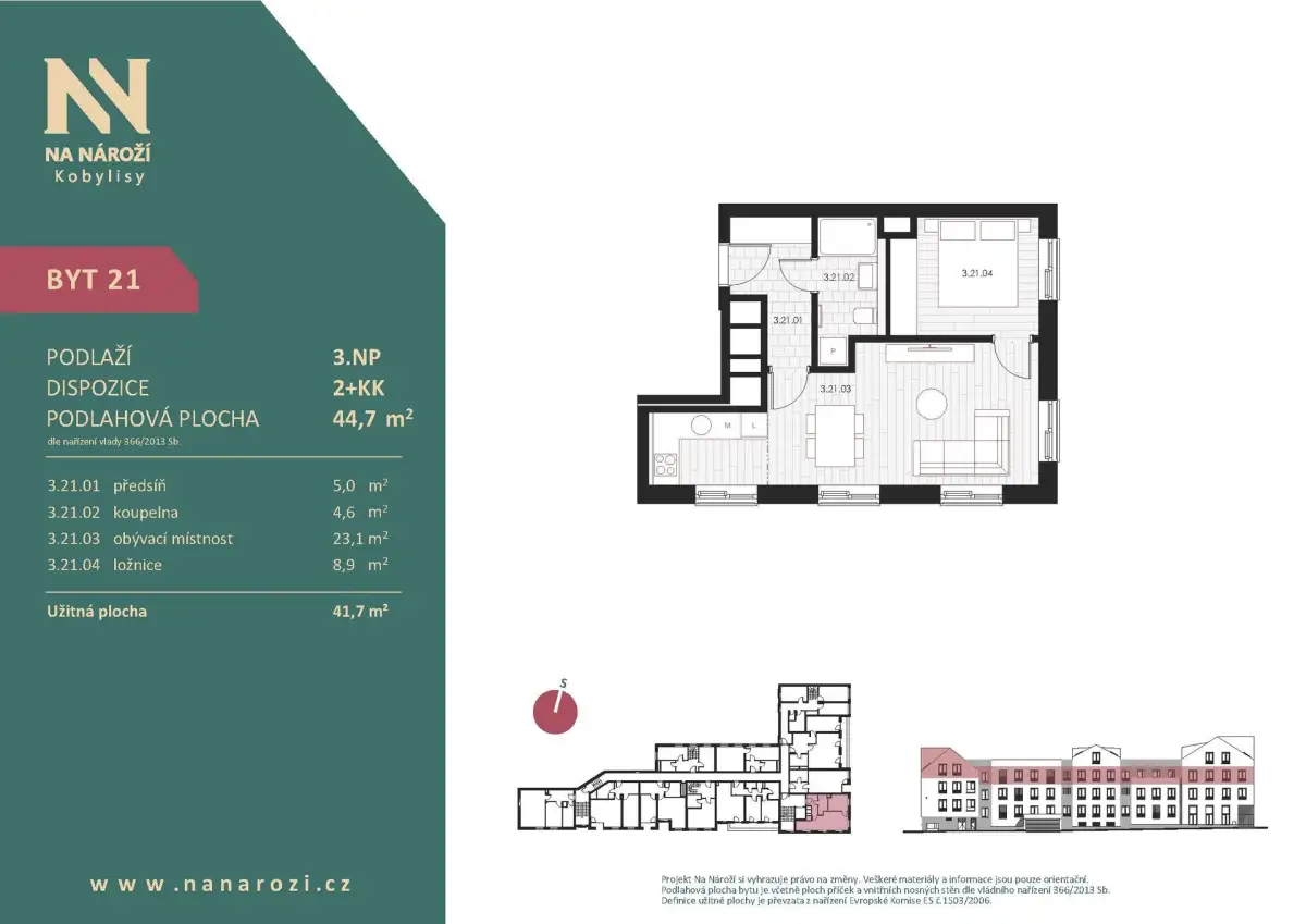 Tento byt 2+kk vznikne v projektu Na Nároží v pražských Kobylisích ve 3.NP moderního bytového domu v pěší dostupnosti metra. Podlahová plocha bytu je 44,7 m², celková plocha bytu činí 41,7 m². K bytu náleží sklep, který je započten v ceně.